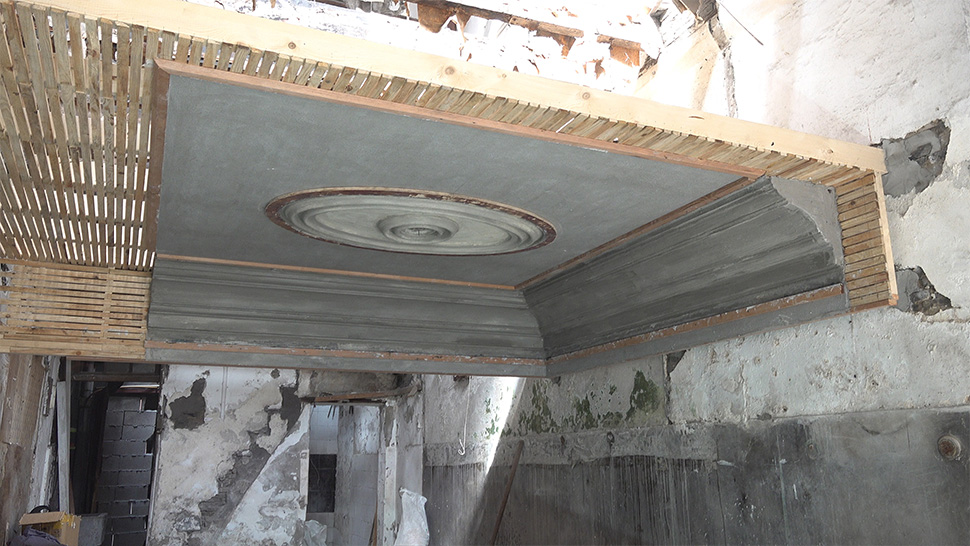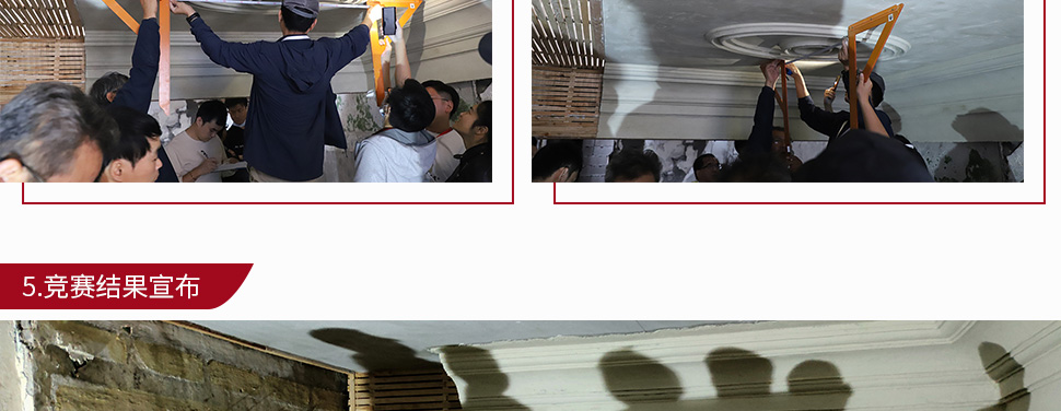 今年的競賽項目是以傳統(tǒng)工藝制作天花線腳和燈圈。賽程分為三天,難度大,時間緊。由于我們抽簽為11號,最后才輪到我們測量和繪圖,因此時間異常緊迫。測量完后自行準備模具、導軌,第二天再到現(xiàn)場在4小時內(nèi)準備線腳、燈圈糙坯制作。第三天需要在4小時扯制線腳、燈圈,可謂是分秒必爭。